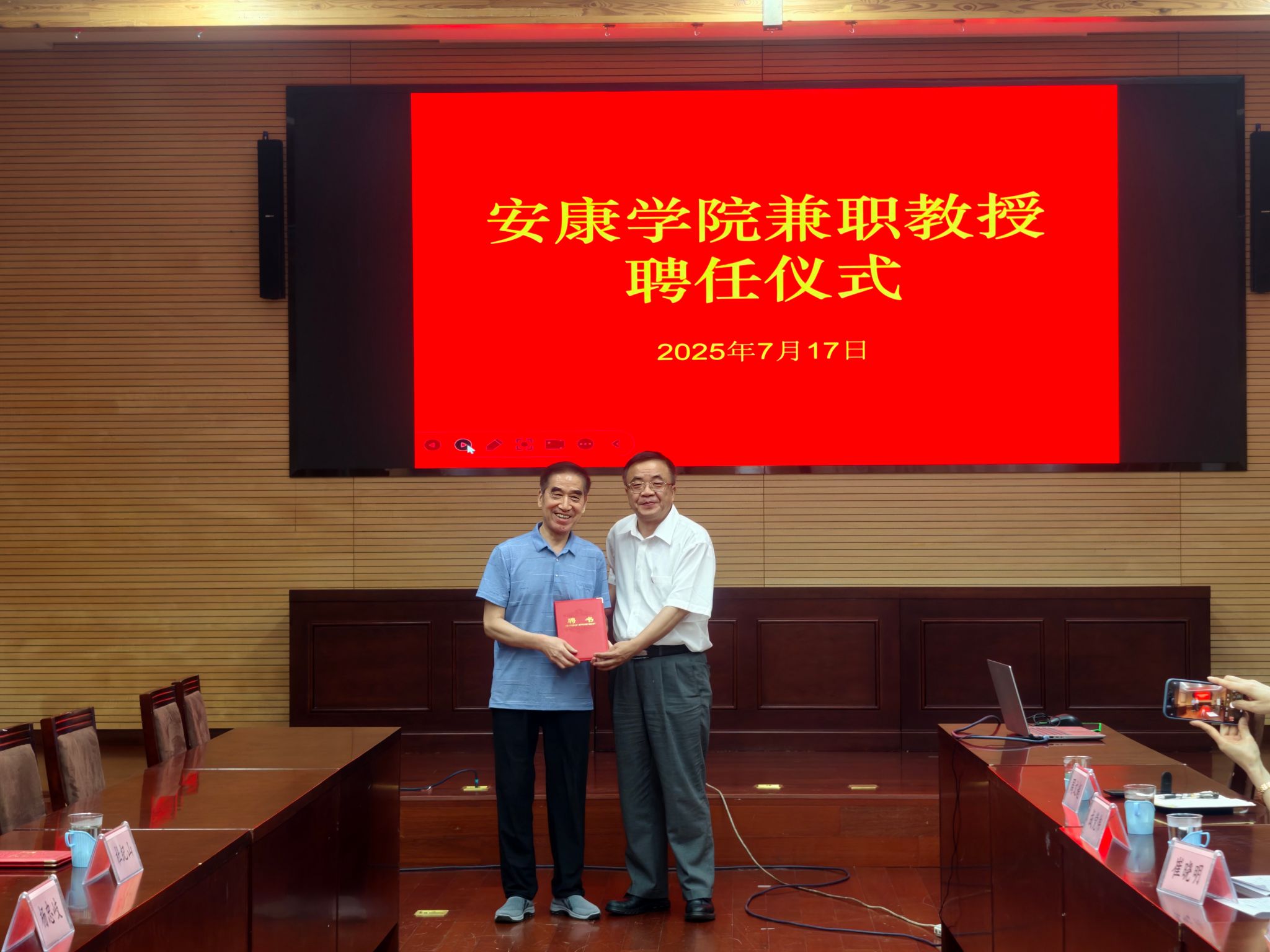 聘任仪式上,崔晓明介绍了杨忠岐研究员在学术领域所取得的卓越成就;余劲代表学校向杨忠岐颁发兼职教授聘书。