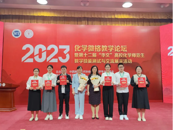 “华文”高校化学师范生教学能力测试与交流展示活动由中国教育技术协会微格教学专业委员会主办,是目前国内教育师范类专业规模最大、参与高校最多的教学技能竞赛展示活动。化学与化工学院6名学生在比赛过程中充分展示了扎实的专业功底、独特的教学设计、娴熟的授课技能和严谨的答辩能力,获得了喜人的成绩,同时团队成员金茹被遴选为优秀代表,在闭幕式上向全国参赛队伍进行了说课和讲课展示。获奖名单如下图所示: