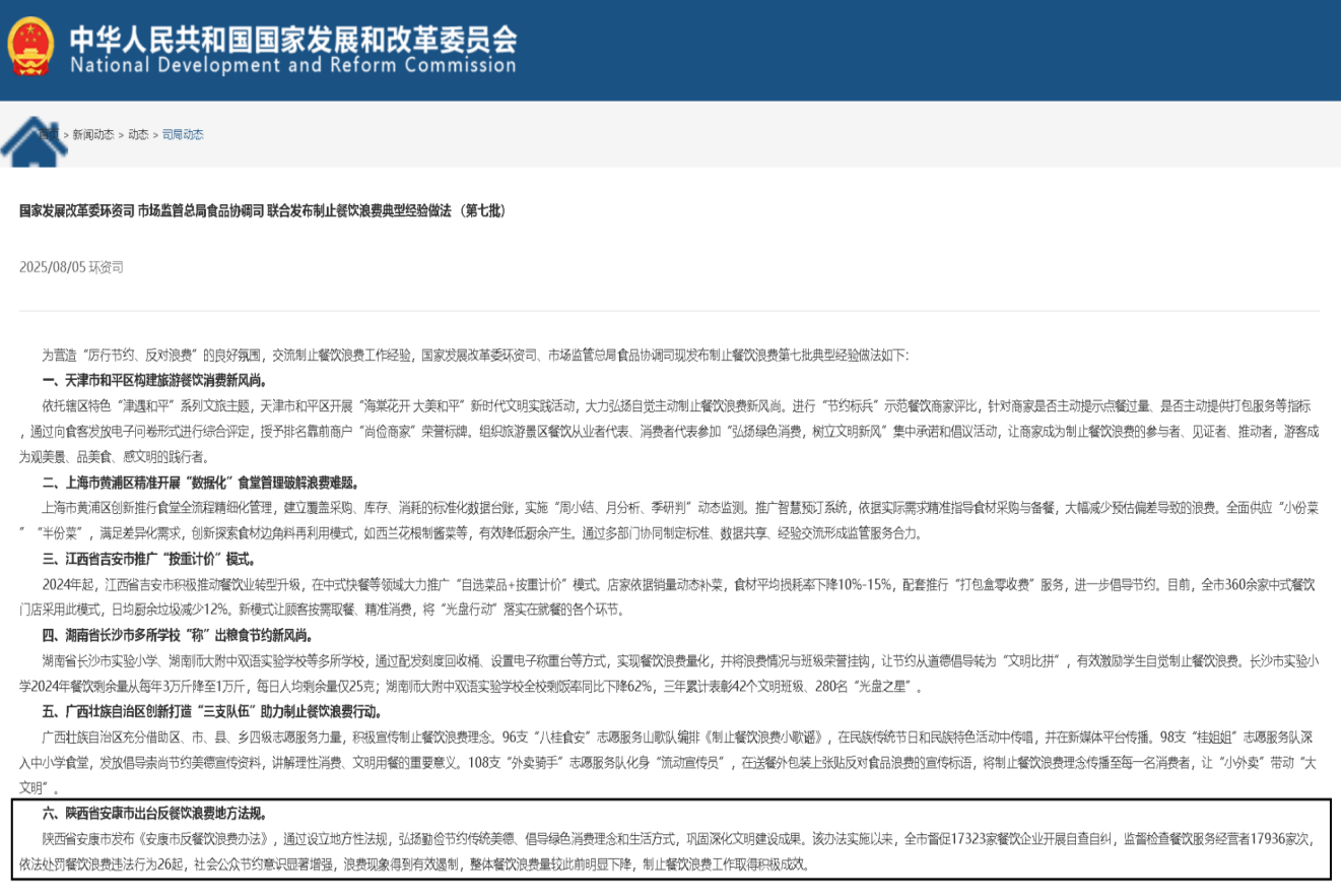 近日,国家发展改革委环资司、市场监管总局食品协调司发布制止餐饮浪费典型经验做法(第七批),安康市出台反餐饮浪费地方性法规——《安康市反餐饮浪费办法》,这一做法成功入选。