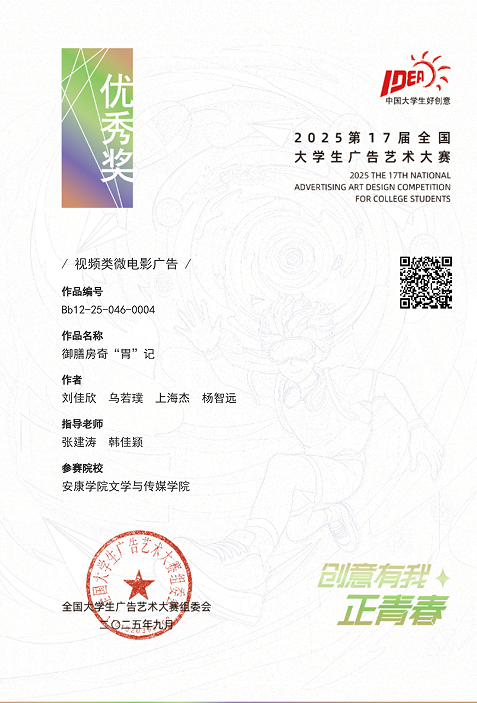 在本次大赛的视频类微电影广告赛道中,由张建涛、韩佳颖两位老师联合指导,刘佳欣、乌若璞、上海杰、杨智远同学共同创作的作品《御膳房奇“胃”记》,不仅成功斩获国家级优秀奖,同时还在省级评选中拿下陕西赛区微电影类作品优秀奖,成为本次大赛中“双奖作品”。