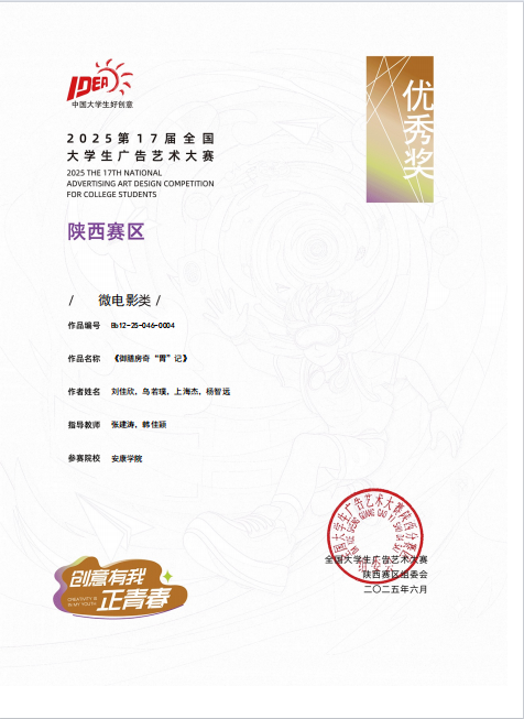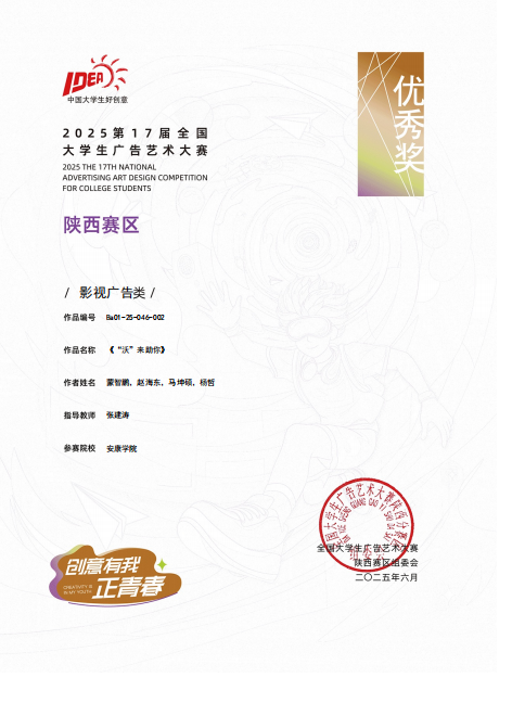 除微电影广告赛道外,在影视广告类作品评选中同样收获颇丰。鲁雨溦老师指导,刘佳欣、乌若璞、上海杰、贾明阳、杨智远同学创作的《“育”见自由,爱我所爱》,凭借独特的创意视角与精良的制作,荣获陕西赛区二等奖;张建涛老师指导,蒙智鹏、赵海东、马坤硕、杨哲同学创作的《“沃”来助你》,也以鲜明的主题表达,获评陕西赛区优秀奖。