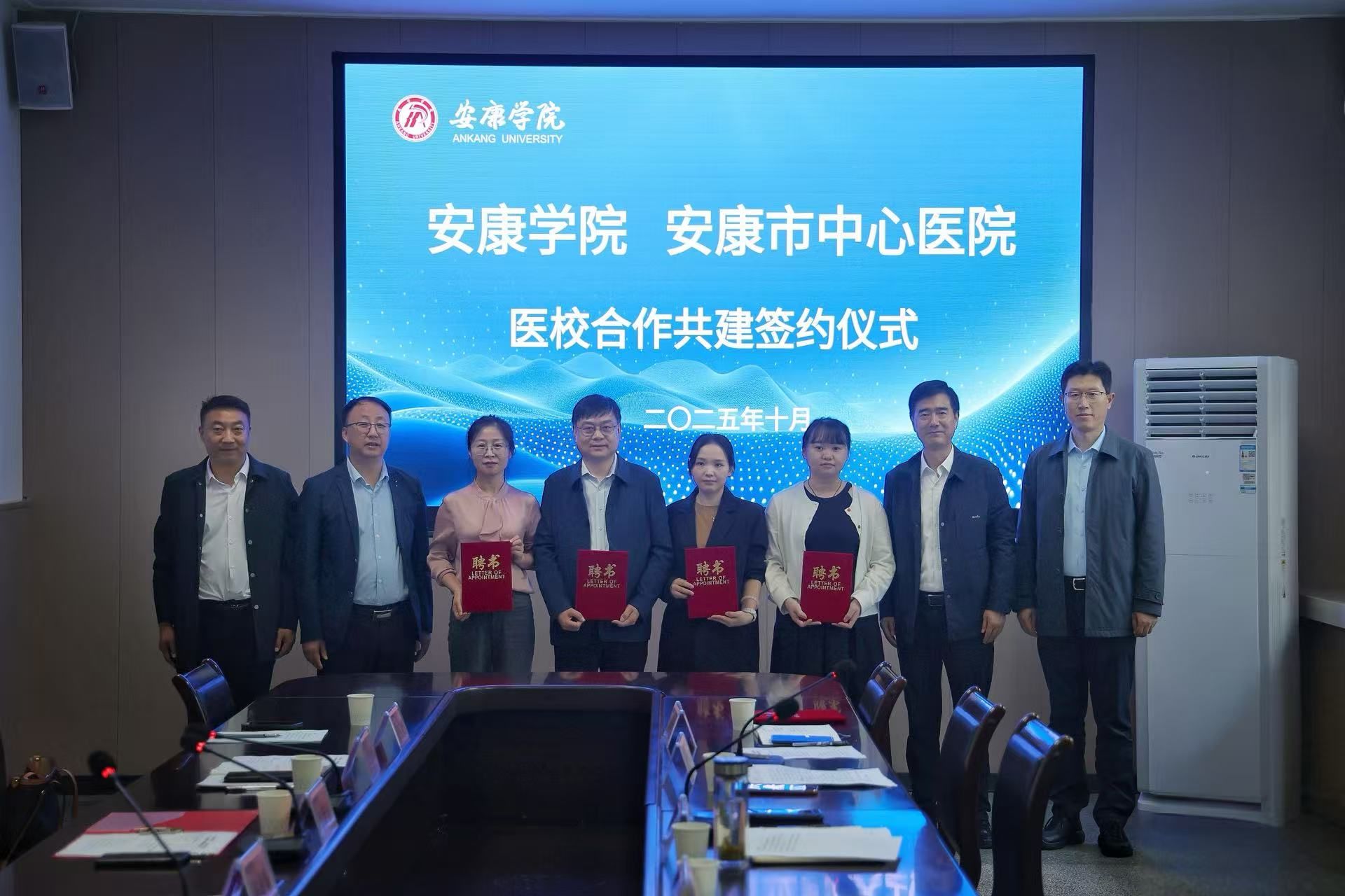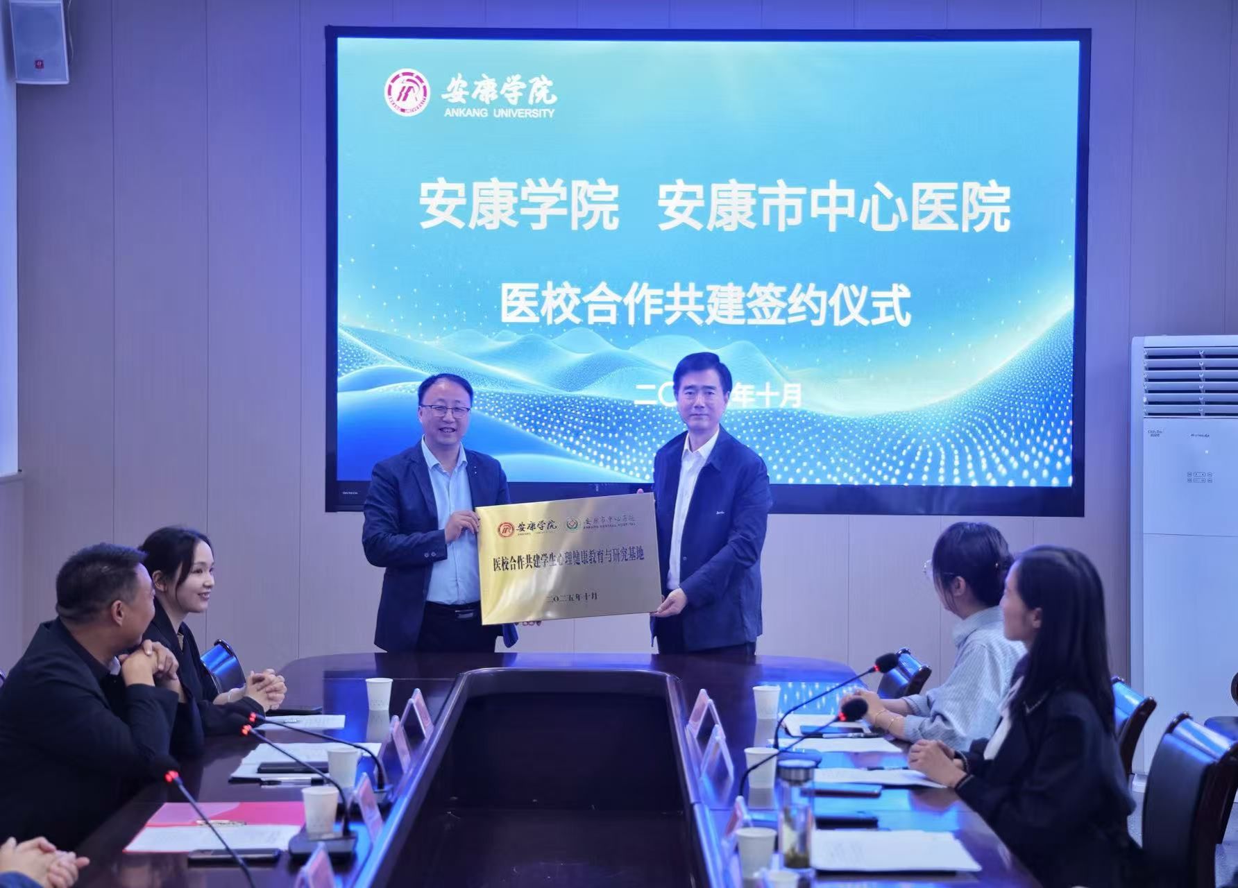 屈险峰向医院授予“医校合作共建学生心理健康教育与研究基地”牌匾,芦伟与安康市中心医院精神科副主任孙敦保签订医校合作协议,并向聘任专家和指导老师颁发证书。