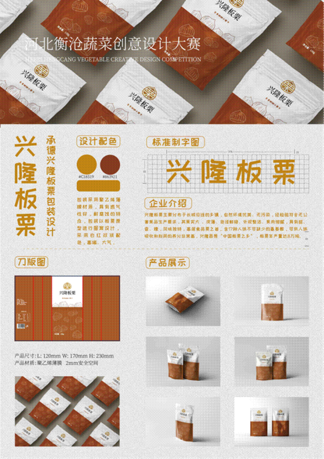 介绍:良乡栗子鸡,板栗软绵甘甜,鸡肉肉质鲜美、劲道。良乡栗子鸡是一道传统的家常菜,主要原料是土鸡和栗子,经过炖煮而成。这道菜肉质鲜嫩,汤汁浓郁,栗子的香甜味道与鸡肉的鲜美融合在一起,非常美味。作品中采用板栗和雏鸡的形象表现品牌,并旦将良乡产地大大标出,目的在于將良乡栗子鸡的地域特色表现出来,提高品牌力。