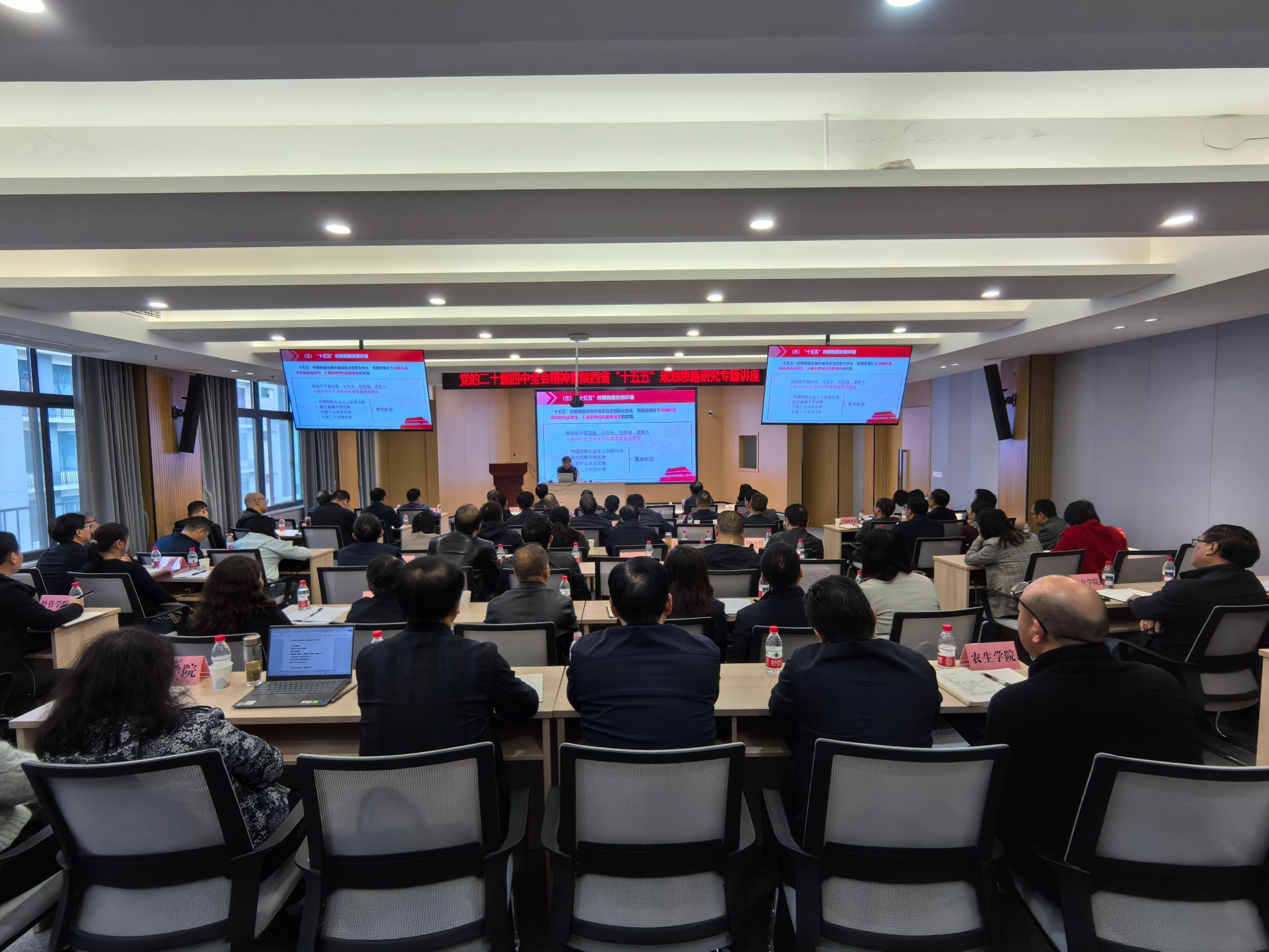 为深刻领会党的二十届四中全会精神,精准把握国家和陕西省重大战略部署,科学谋划学校“十五五”事业发展蓝图,11月5日下午,Beat365举办“党的二十届四中全会精神暨陕西省‘十五五’规划思路研究”专题报告会,特邀陕西经济联合会会长刘迎军作专题报告。学校领导、各职能部门主要负责人、二级学院院长、党总支书记、分管科研副院长及学科带头人参加会议。报告会由校长余劲主持。