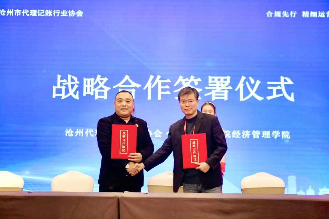 李建忠代表经管学院向大会致辞。他表示,代理记账行业在企业初创、成长上升、转型升级、IPO辅导、专业财税人才培养等过程中发挥着重要作用。协会的成立,不仅可以在未来的代理记账行业工作中发挥积极的作用,更可以助力经管学院的专业建设和应用型专业人才培养,赋能学校师生,提升实战技能。在双方代表的见证下,李建忠与沧州市代理记账行业协会匡洪涛会长共同签署了校企战略合作协议。
