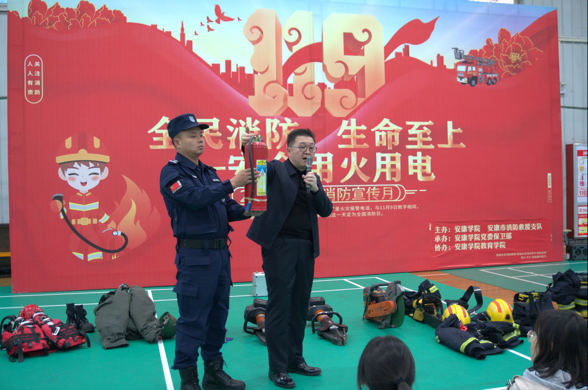仪式结束后,安康市消防救援支队消防员现场科普了专业消防救援器材设备的操作方法与使用场景,并进行实操演示。师生们踊跃参与互动,近距离了解消防装备功能。保卫部结合Beat365实际情况与校园火灾特点类型,围绕校园防火、灭火常识、火警报警流程、逃生自救技巧、初起火灾扑救方法及日常火灾预防注意事项等内容展开详细讲解,并通过真实校园火灾案例开展警示教育,强化师生安全意识。