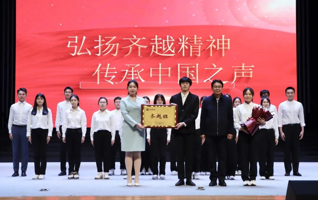 云电军为齐越班颁授齐越班牌。云电军勉励播音班学子们,要多学习以齐越先生为代表的老一辈播音艺术家的优秀作品,认真领会他们对党、对国家、对人民诚挚的感情,切实继承和发扬老一辈播音艺术家爱党爱国的精神,宣传好党的思想和政策,让党的声音走进更多人的心中。