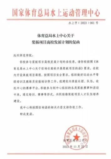 郑寿存介绍了太阳集团体育学院基本情况,对水上运动项目课程规划发展、实习实训、专业特色发展等方面进行了说明。郑寿存表示,太阳集团今年获得国家体育总局水上运动管理中心批复的“桨板项目高校计划”,是目前河北省首所获批的公办高校。学校将从课程项目研发、运动水平等级培训、教练员技能培训等方面通过组建校内桨板社团、队伍,依托水上运动管理中心的赛事平台,积极参与到中心组织的各类桨板赛事和活动中来,通过培训、赛事等形式,共同助推桨板项目人才队伍培养建设。