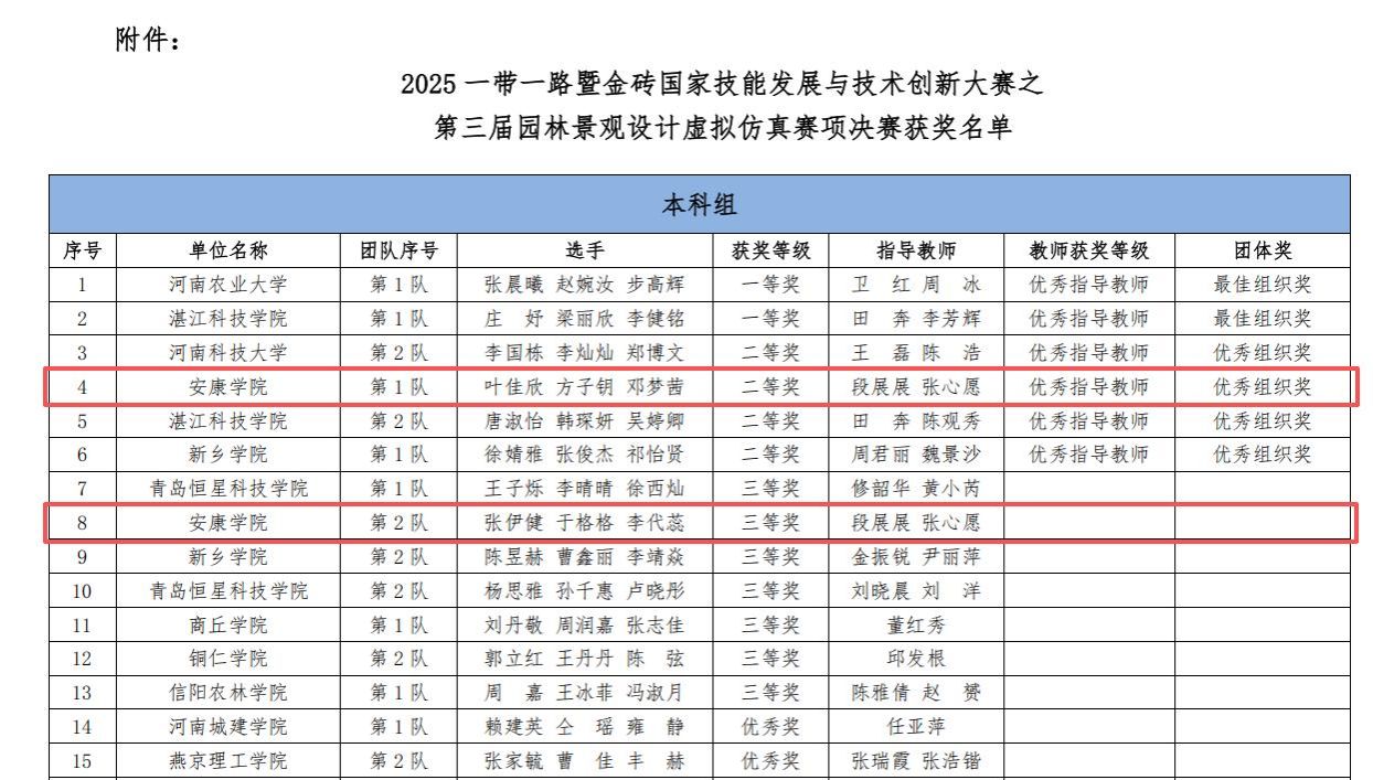 近日,“2025 一带一路暨金砖国家技能发展与技术创新大赛——第三届园林景观设计虚拟仿真赛项决赛”圆满闭幕。农生学院精心组建的2支参赛队伍从全国众多高校参赛队伍中脱颖而出,斩获多项荣誉:叶佳欣、方子钥、邓梦茜三名同学荣获本科组二等奖,张伊健、于格格、李代蕊三名同学荣获本科组三等奖;指导教师段展展、张心愿获评“优秀指导教师”;农生学院荣获“优秀组织奖”。
