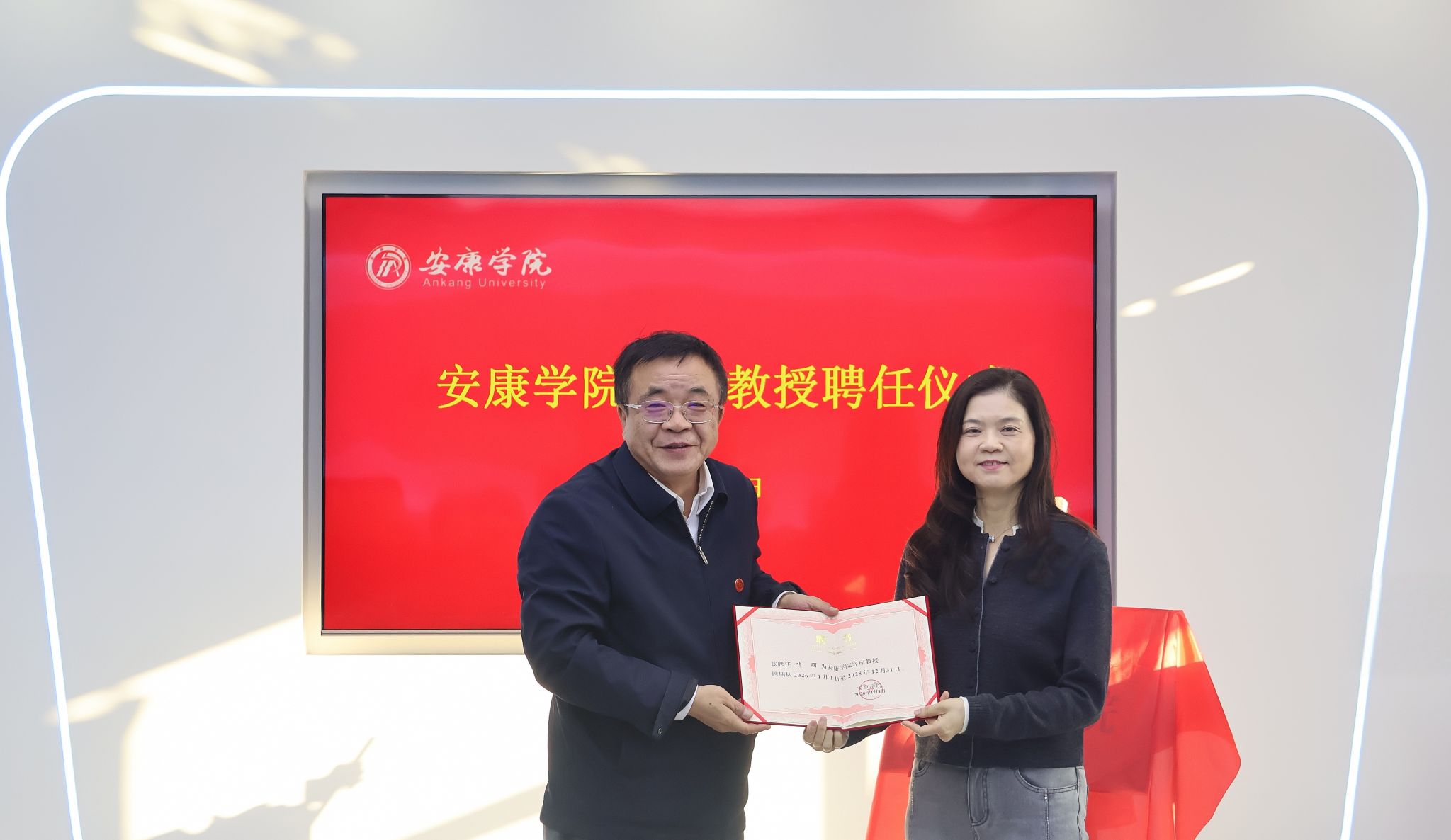 1月7日,学校举行客座教授聘任暨药学院揭牌仪式。校长余劲为澳门科技大学药学院课程主任叶丽教授、李欣志助理教授颁发Beat365唯一官方网站客座教授聘书,与两位客座教授、陕西新润药业董事长郑智伟共同为药学院揭牌。三方围绕合作事宜展开座谈交流,副校长崔晓明主持会议,教务处、科研处、合发处、外语学院(国际教育学院)、化环学院、医学院等相关部门负责人及教师代表参加座谈。