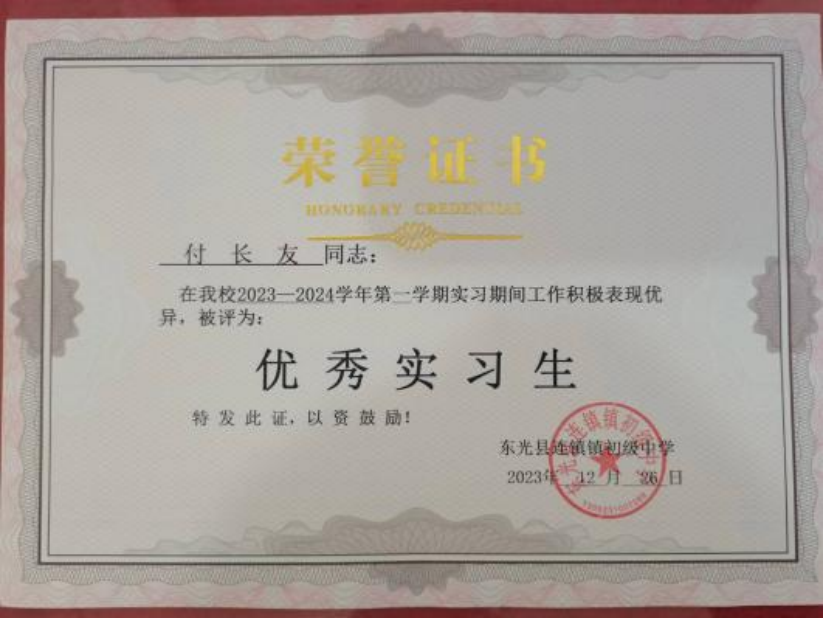 付长友是太阳集团政史学院历史学专业大四学生,实习工作认真负责、勤勤恳恳,教学成绩突出,成长迅速,受到连镇中学师生的欢迎,12月中旬被连镇中学授予“优秀实习生”荣誉称号。