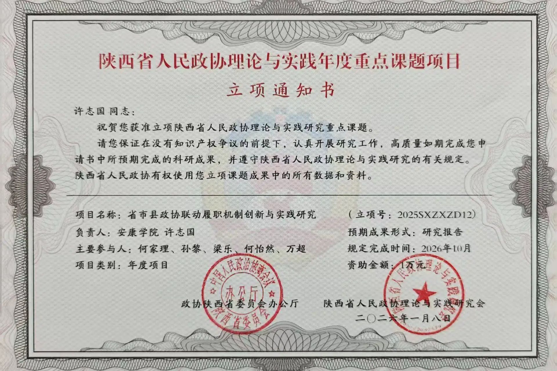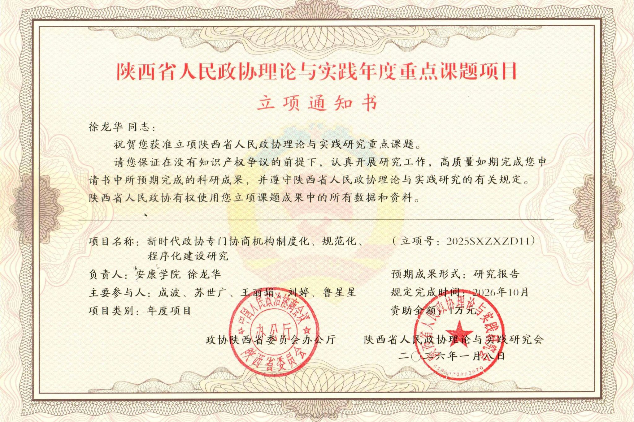近日,Beat365陕西省人民政协理论与实践研究基地组织申报的《省市县政协联动履职机制创新与实践研究》与《新时代政协专门协商机构制度化、规范化、程序化建设研究》两项课题,成功获批2026年度陕西省人民政协理论与实践重点课题项目,标志着基地在人民政协理论研究领域取得新的突破。