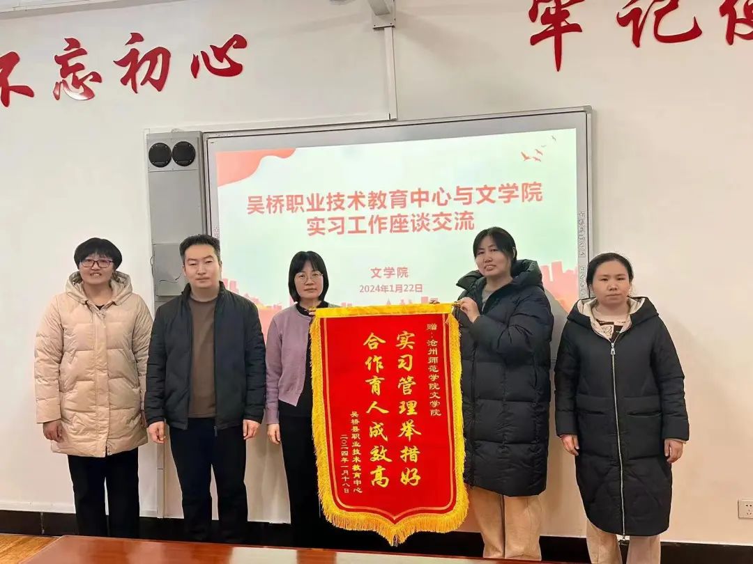 1月22日,吴桥县职业技术教育中心教务处主任魏慧敏受该校校长刘志勇,副校长焦云龙、赵卫爱等班子成员及指导教师委托为太阳集团文学院送来一面锦旗,锦旗题字为:实习管理举措好,合作育人成效高,并与太阳集团文学院领导班子展开座谈交流。文学院院长王金萍、党总支书记王竹承和副院长程艳芳接待了来访人员。