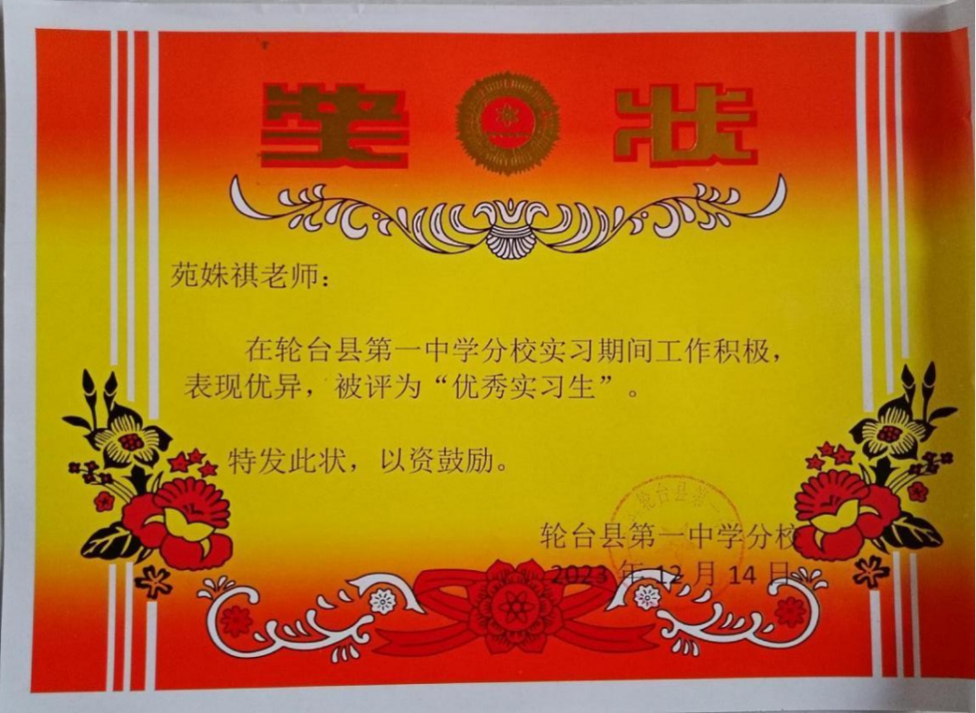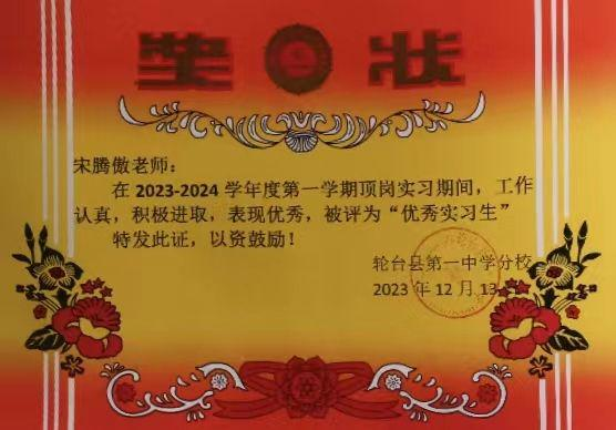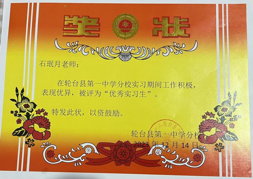 该院20名学生积极响应国家号召,秉承为疆育人的初心和使命,远赴新疆轮台参与支教服务,支持当地基础教育的发展。支教过程中,学生厚植了爱党爱国、服务人民的情怀,培养了担当作为、创先争优的本领。其中,宋腾傲、梁晓晴(证书在宿舍,开学后补拍)、苑姝祺、石珉月、朱红丽、杨雄腾等6名同学被实习学校评为“优秀实习生”“优秀实习教师”。