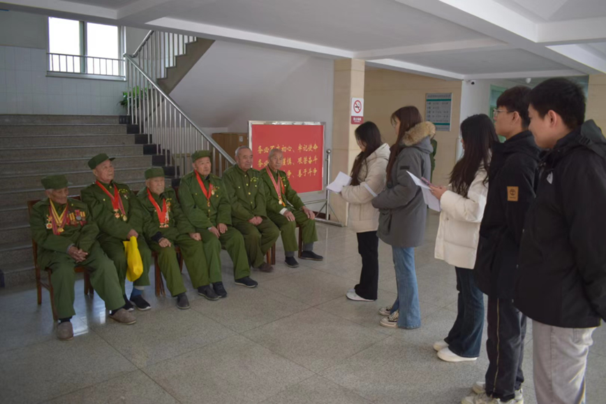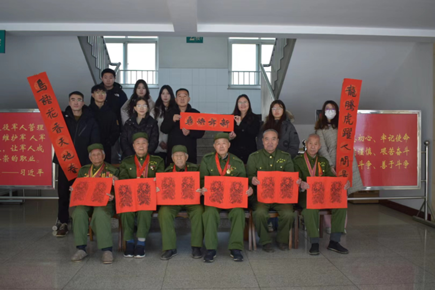 老荣军们讲述了自己参加战争的经历,坚定的信仰和拼搏的精神令现场师生动容。师生献上手写春联和门神版画,为老荣军们送出新年祝福。