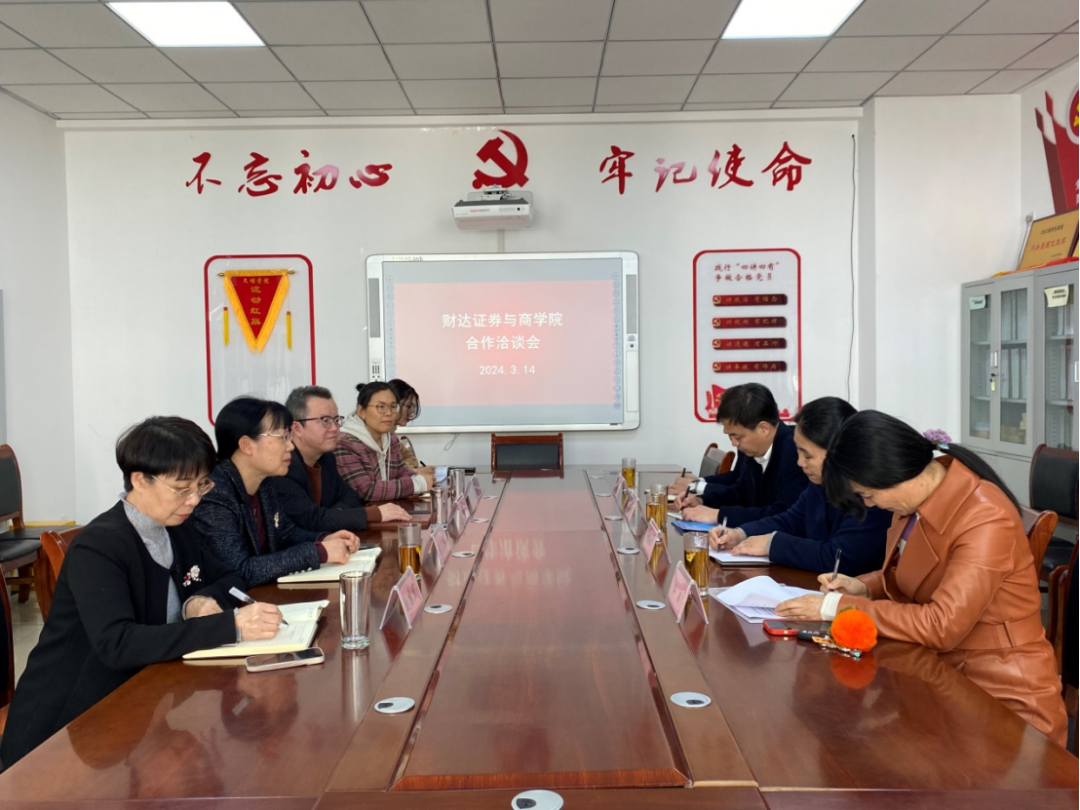 为了深入探索产教融合、拓宽学生实习就业渠道,提升学生就业竞争力,3月14日下午,商学院与财达证券联合举行合作交流会。商学院院长张兰新,党总支书记崔胜全,副院长刘秀宏、李洪维,财达证券解放中路营业部总经理张洪梅,总经理助理张吉通、财富中心经理孙颖、客户部经理李朝辉参加。