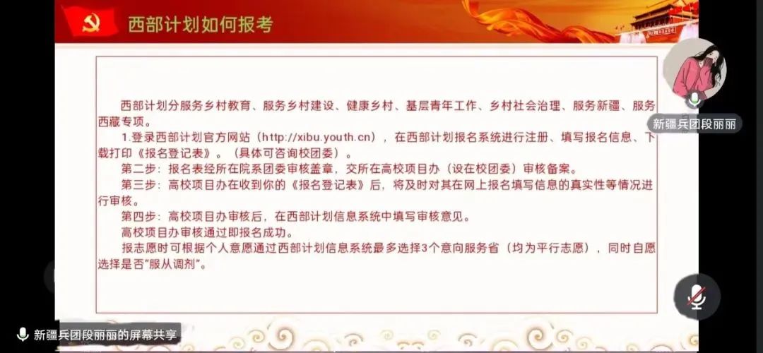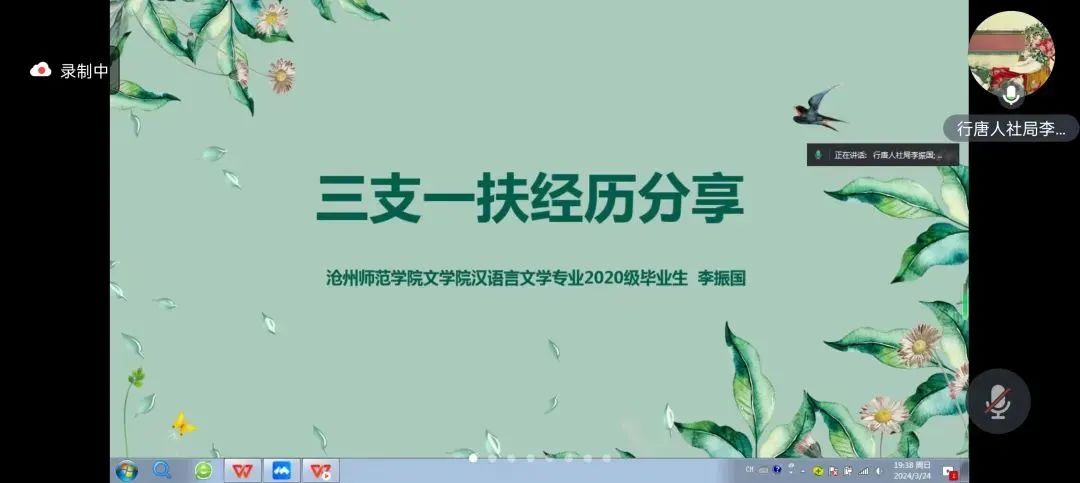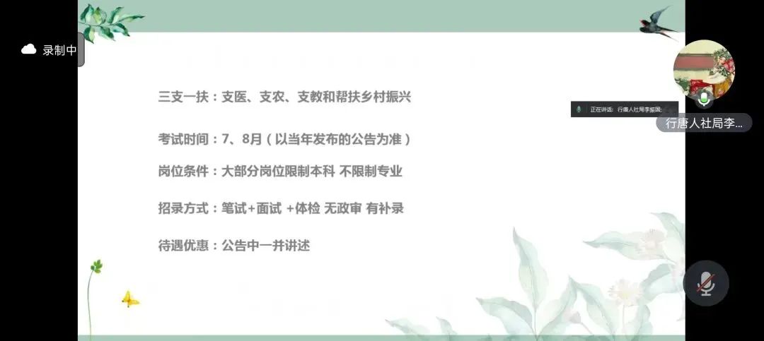 两位同学从背景实施、服务内容、服务保障、优惠政策等方面入手,全面分享了“西部计划”“三支一扶”的招考流程、备考策略等。他们还分别讲述了各自在新疆生产建设兵团、石家庄市行唐县人社局开展社区居民服务、帮扶乡村振兴的工作经历及体悟。