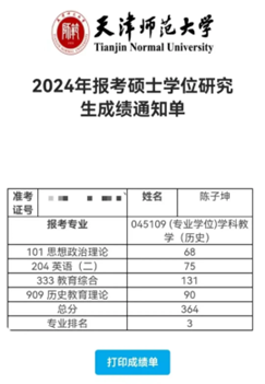出于对历史教育的热爱,我考研的目标选择了天津师范大学学科历史专业。在备考期间,学校和学院都提供给我许多帮助和便利,真应了“当你努力时,你会感觉全世界都在帮你”这句话。在这里我也要感谢我本科期间的辅导员老师刘晴,她时常帮助我,考研前一天她还帮助我调节心情,让我能够全身心地应对考试,最终,我以初试第三的成绩顺利通过复试,现已被天津师范大学拟录取。