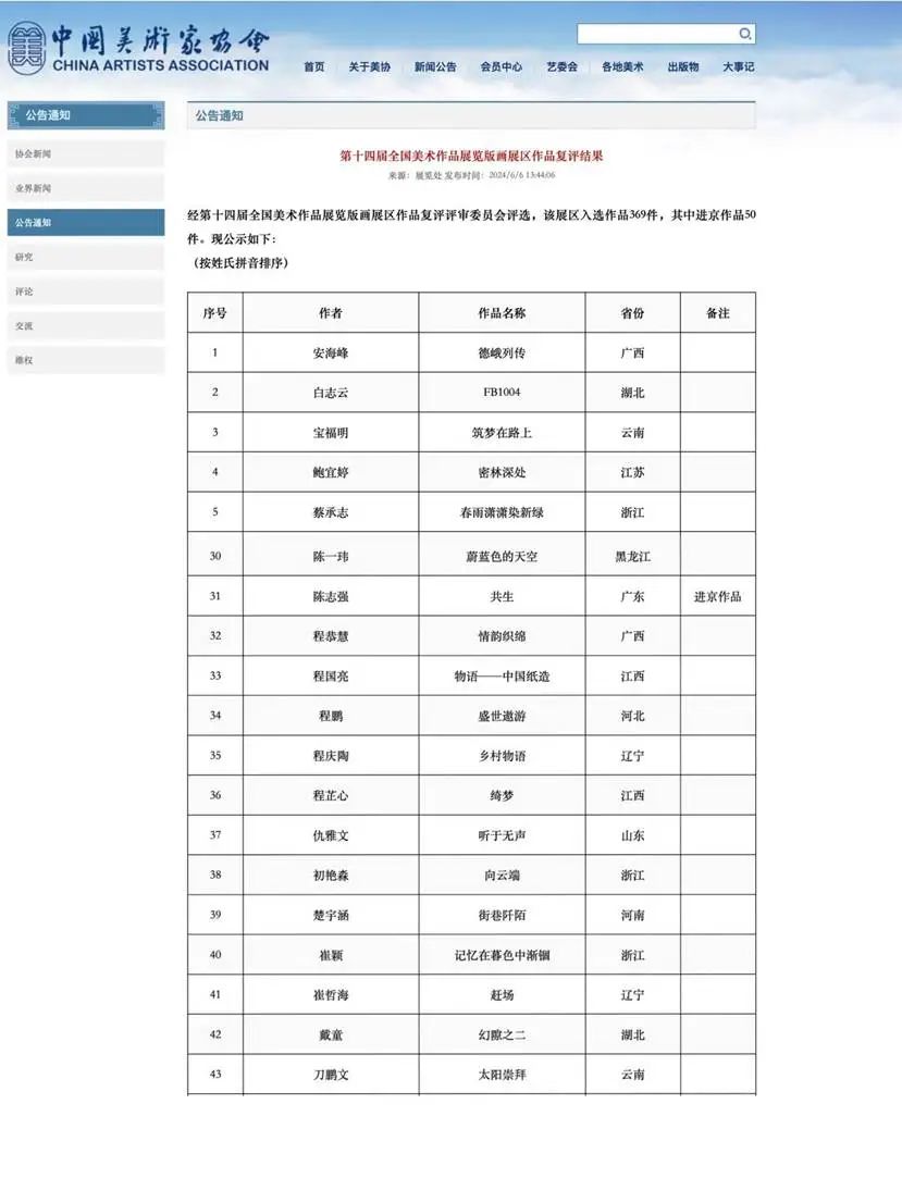 据悉,第十四届全国美术作品展由文化和旅游部、中国文学艺术界联合会、中国美术家协会主办,该展览创办于1949年,是中国规模最大参与范围最广、作品种类最多、最具影响力和权威性的国家级综合性美术大展,每五年举办一次,代表了国家美术创作的最高水平,同时也是对全国美术界每五年的发展阶段的全面检阅与展示。本次版画展区河北省共入选7件作品。