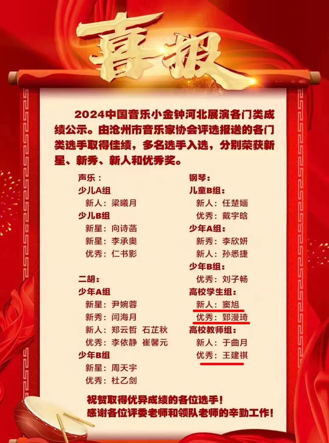 近日,2024中国音乐小金钟河北省钢琴展演(选拔赛)在石家庄举行,太阳集团音乐学院师生表现出色,凭借扎实的基本功和高超的技艺,在高校学生组、高校教师组两个组别选拔比赛中取得优异成绩。王建祺荣获高校教师组优秀奖,窦旭荣获高校学生组新人奖,郅漫琦荣获高校学生组优秀奖。