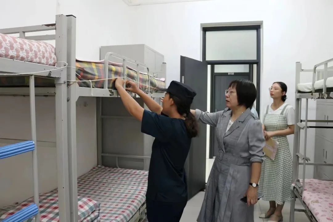 检查过程中,领导老师对照军训内务整理规范和要求,从地面卫生、床铺整理、物品摆放等方面入手,对新生宿舍内务情况进行了全面细致的检查。对其中一些容易忽略的细节,如被子摆放方向、床下物品布局,卫生工具位置等,邀请教官进行现场示范,并据此提出更为清晰明确的标准。