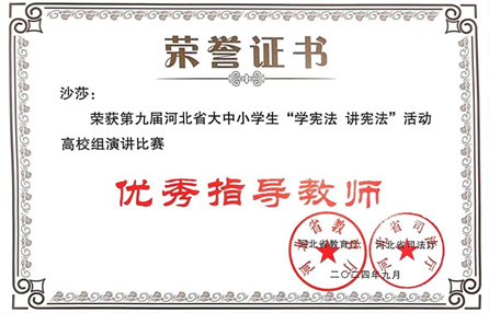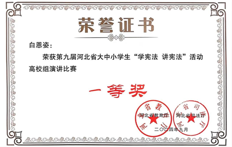近日,第九届“学宪法讲宪法”演讲比赛河北赛区总决赛圆满落下帷幕,经过层层选拔,齐越传媒学院2023级播音与主持艺术专业的白恩姿凭借出色的语言能力、饱满的精神风貌和扎实的宪法知识,一路过关斩将,最终荣获演讲比赛(高校组)一等奖,指导教师沙莎荣获优秀指导教师奖。