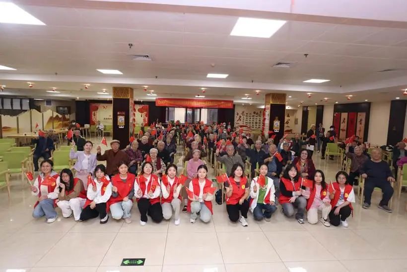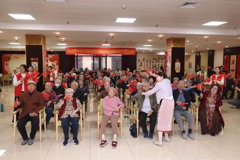 在启动仪式后,齐琪及志愿者同学们开展了相关活动。通过热身活动,引导老人们按照节拍做一些如拍手、敲腿的基础律动,随着音乐的响起,老人们通过音乐的律动挥舞着手中的乐器,脸上显露出愉悦的笑容,展现出心中的快乐。随后,全体齐声合唱《没有共产党就没有新中国》,大家手里挥舞着国旗,将现场气氛推向高潮。