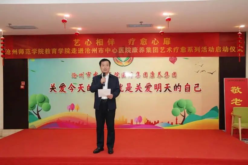 苟增强在致辞中向温秀玲董事长以及沧州市中心医院康养集团的领导与全体团队成员表达了诚挚的谢意。他指出,艺术与康养相结合的平台,丰富了老年人的精神生活,提高了他们的幸福感,教育的意义不仅在于知识的传授,更在于情感的交流和心灵的震撼,而艺术作为一种独有的交流手段,能跨越语言的障碍,触动人心。苟增强详细介绍了本次活动的具体环节,涵盖绘画、音乐、手工等多种艺术形式,目的在于让老年朋友们在艺术创作中感受乐趣,在音乐的节奏中寻找共鸣。此次艺术疗愈系列活动对于师生而言,不仅是专业技术的实践机会,更是一次人文关怀的体现。要求师生要以真诚之心,热情之态,关爱每一位老年朋友,传递艺术的力量与师院的温暖。