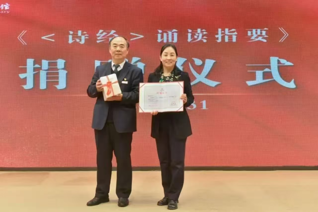 张海燕教授代表学校向市图书馆捐赠齐越传媒学院播音教研室教师集体编著的《诗经诵读指要》。