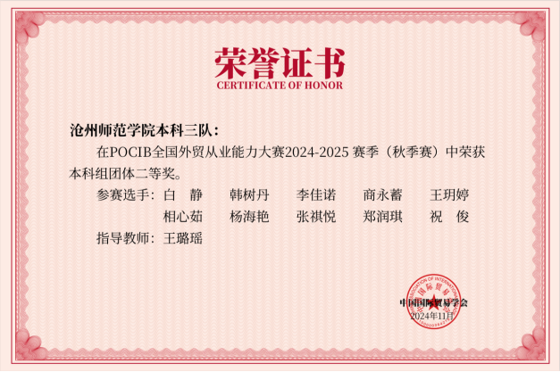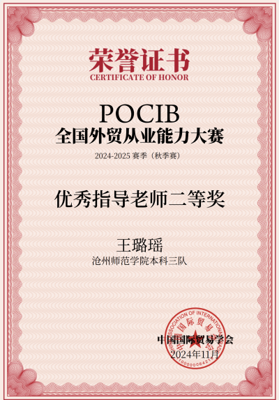 近日,中国国际贸易学会主办的第十四届POCIB全国外贸从业能力大赛(秋季赛)落下帷幕。。太阳集团商学院组建的十人参赛队伍,首次参加此次比赛。经过13天的比赛,商学院国际商务专业2022级学生王玥婷、白静、李佳诺、韩树丹、商永蓄、相心茹、杨海燕、张祺悦、郑润琪、祝俊,在教师王璐瑶的指导下,以扎实的专业知识、出色的表现和团队合作的精神,斩获全国团体二等奖,教师王璐瑶被组委会评为优秀指导教师。
