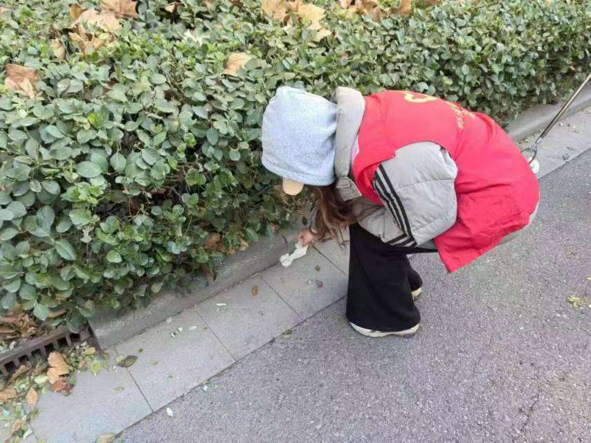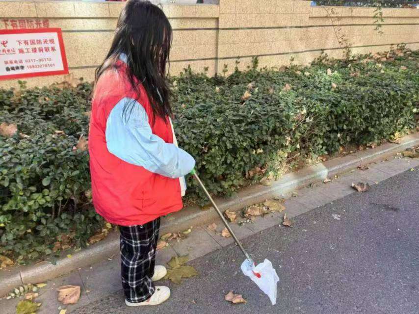 志愿者们一丝不苟地清理着路面上的落叶、烟蒂、废纸、塑料袋等杂物,不遗漏任何一处角落,并将这些垃圾妥善放入垃圾袋。
