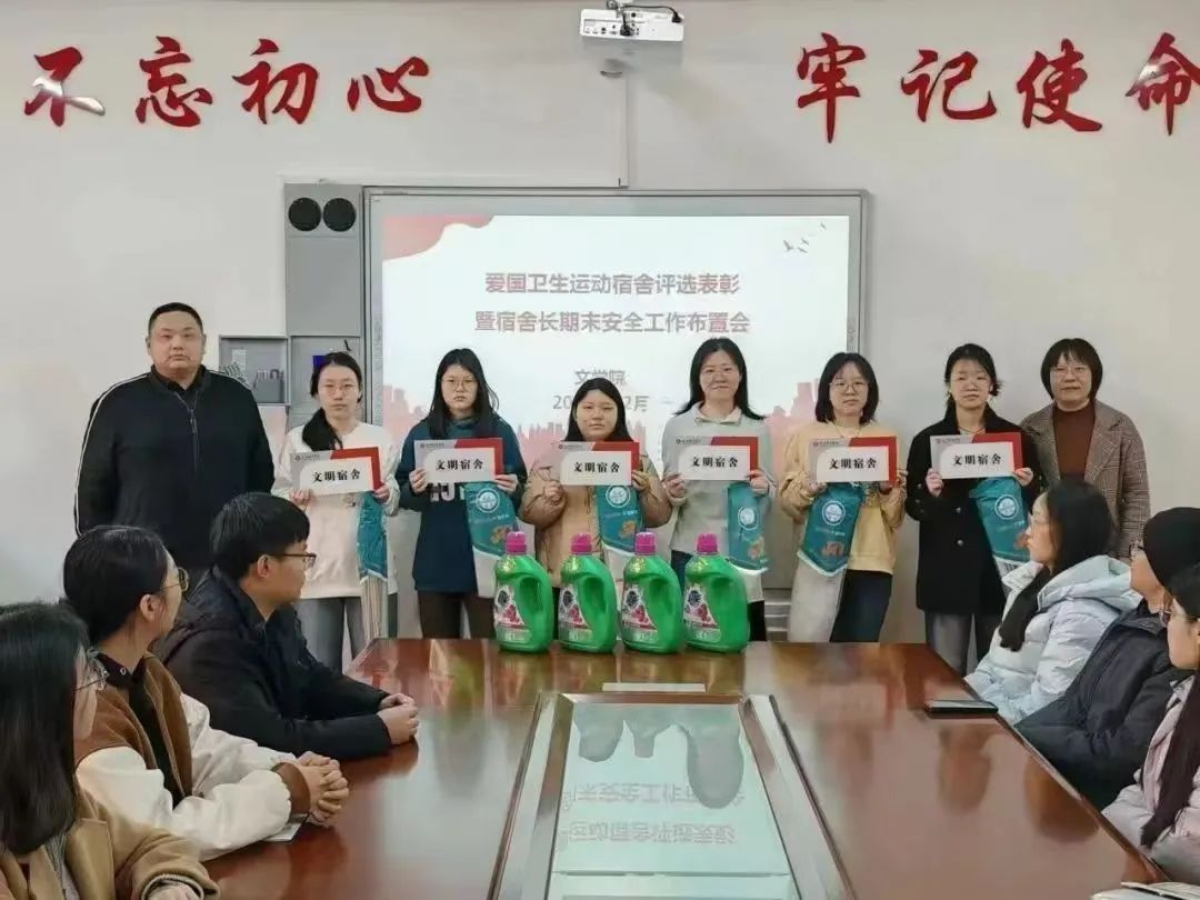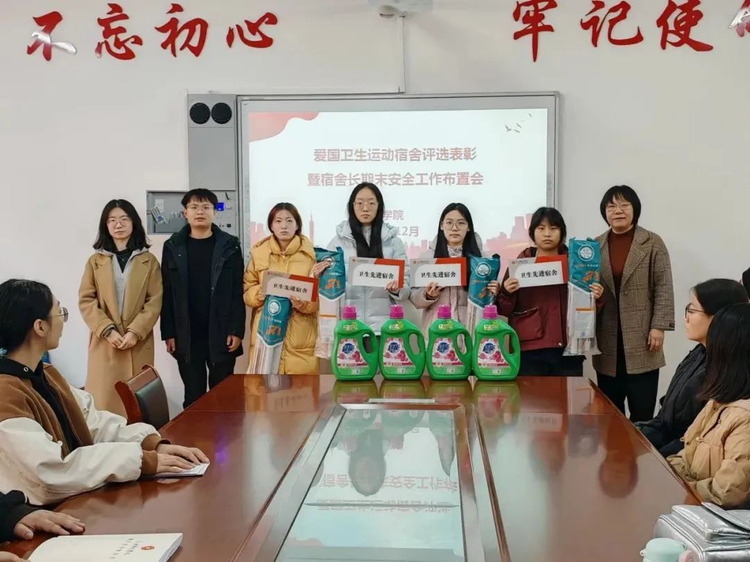 活动上,各班辅导员老师为在学院每周爱国卫生运动常态化检查中表现优秀、且通过学校“文明宿舍”“卫生先进宿舍”验收的宿舍授牌,并颁发了洗衣液、平板拖把、生活用纸等奖品。