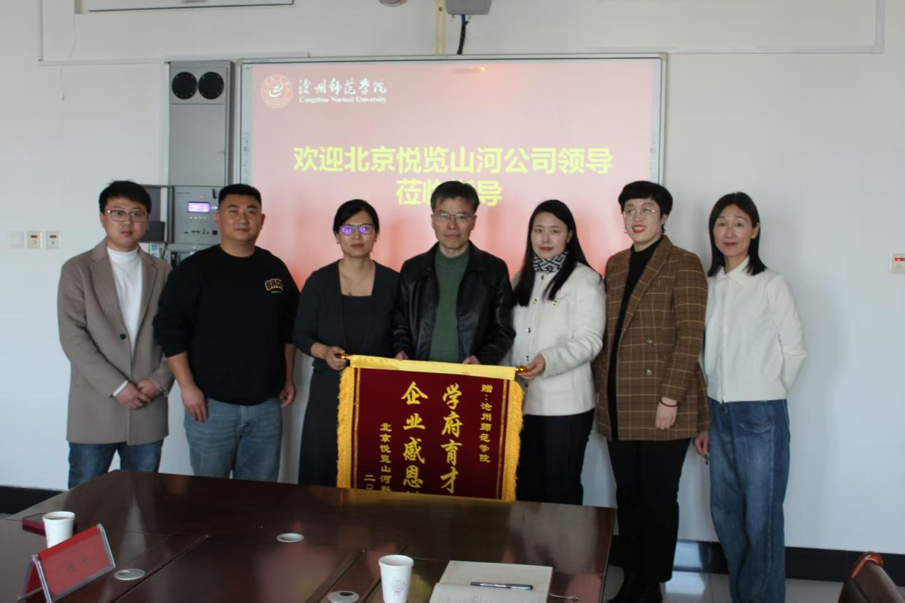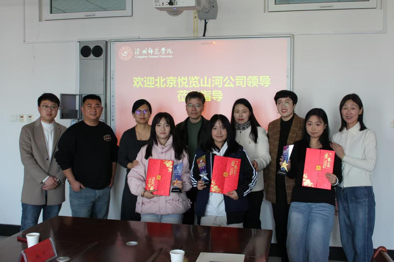 北京悦览山河科技有限公司为经济管理学院三位优秀实习生张玉洁、赵海煦、胡子莼颁发奖杯与证书,并向经济管理学院赠送锦旗,对学院相关工作表示高度认可。