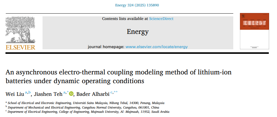 近日,机械与电气工程学院青年教师刘伟,以第一作者身份在国际能源领域权威期刊《ENERGY》(注:SCI一区,Top期刊,影响因子为9.0)发表题为《An asynchronous electro-thermal coupling modeling method of lithium-ion batteries under dynamic operating conditions》文章。