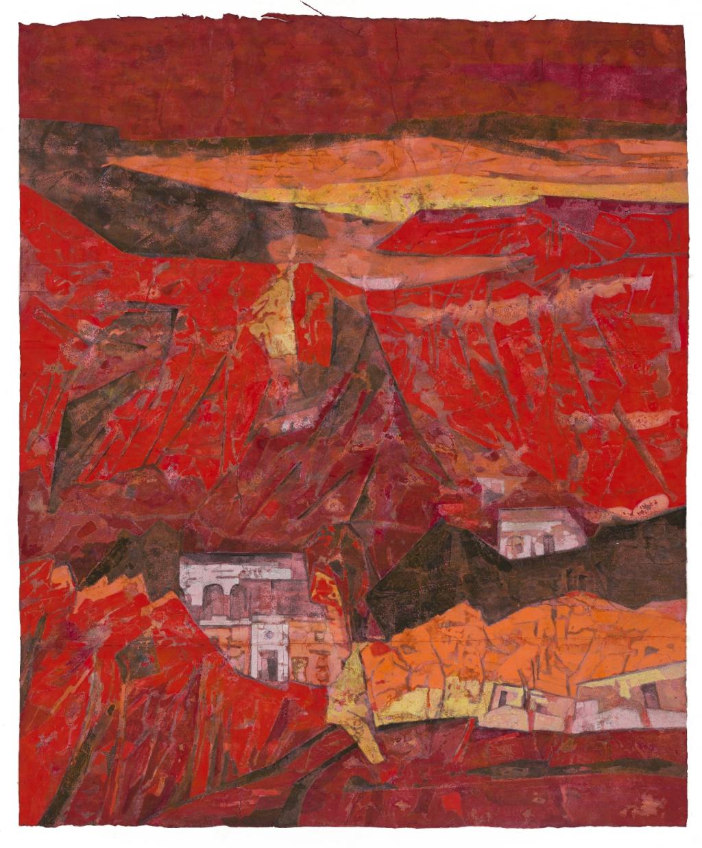 这幅画作以浓烈的红色调为主,运用了色层叠加的技法,展现了太行山与红色建筑之间的融合。画面表现出强烈的视觉冲击力,红色的山体象征着热烈与生命力,而点缀其中的建筑物则赋予作品一种人文情怀,展示出人与自然共生的意境。通过色彩的对比与画面的层次感,作品传递了土地的厚重感以及历史沉淀的美感,既有现代艺术的抽象表现,又蕴含深刻的文化意蕴。