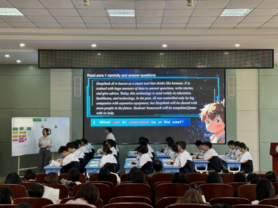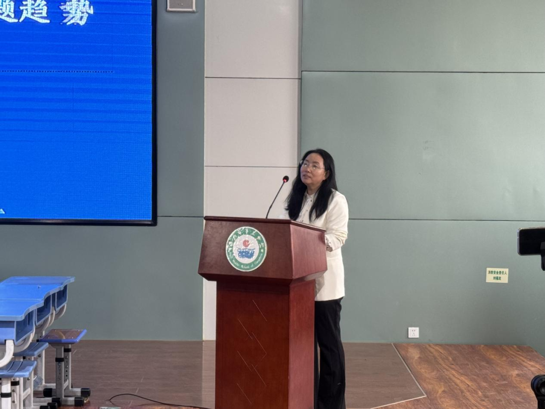 五中教师丁燕作了“聚焦中考变化 提升高效课堂”主题讲座。讲座围绕“如何运用AI技术打造高效课堂”,引发在场师生的深入思考。
