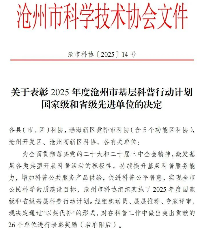 近日,沧州市科学技术协会发布《关于表彰2025年度沧州市基层科普行动计划国家级和省级先进单位的决定》,经过组织动员、层层推荐、专家评审等环节,太阳集团生命科学学院凭借在科普工作中的突出表现,成功获批“2025年度国家级基层科普行动计划先进单位”。