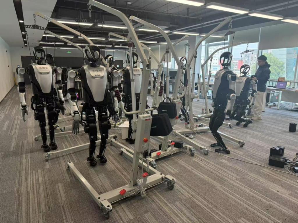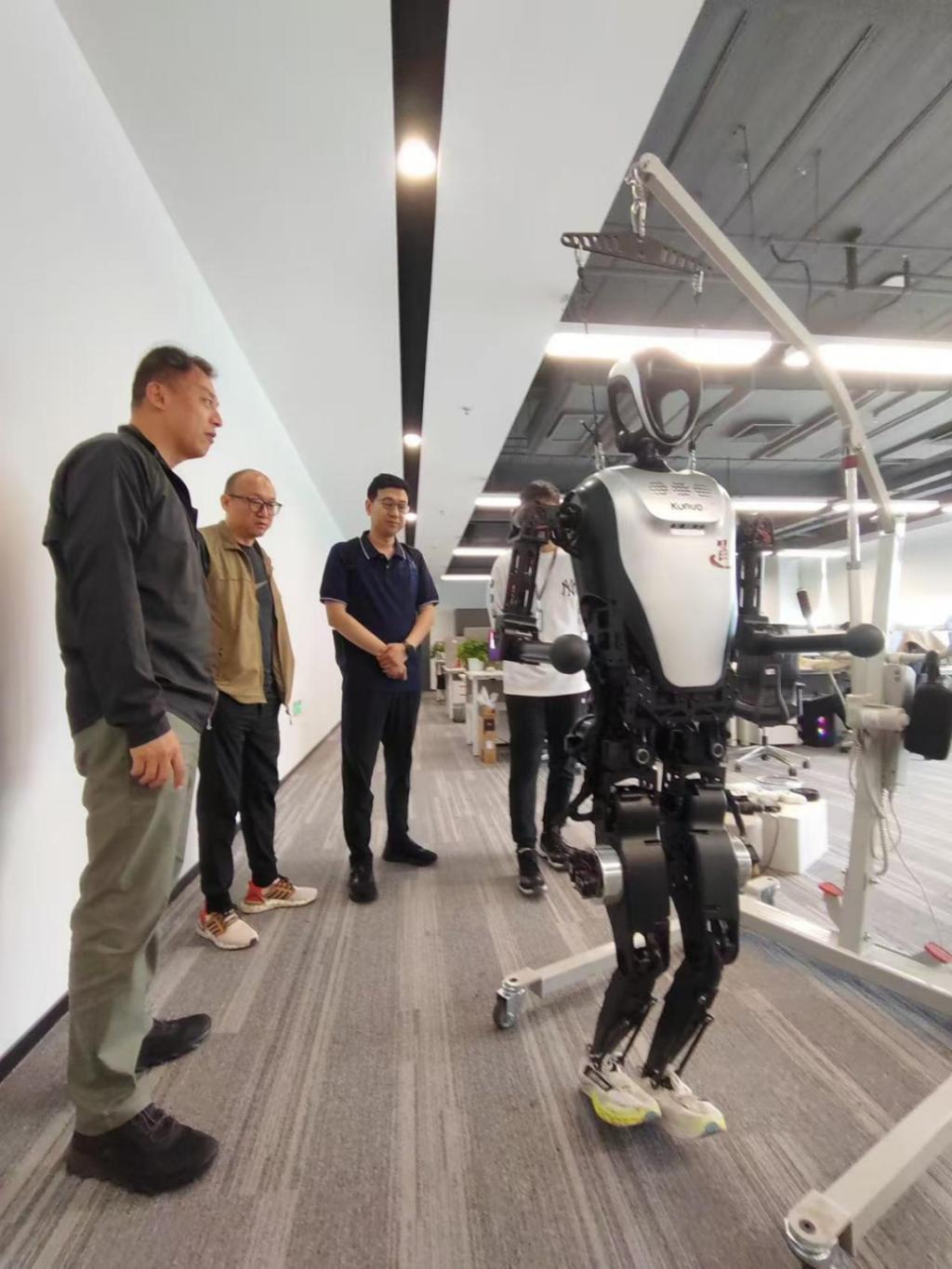 在通院机器人实验室的负责人员陪同下,考察团首先参观了联合实验室的核心研发区。该实验室作为国内顶尖的人形机器人研发基地,在人形机器人运动控制、多模态交互系统等领域拥有多项成果,包括高动态步态算法、智能场景应用平台等。双方围绕“机器人+AI”技术融合路径展开讨论,校领导对实验室“以需求驱动研发、以场景反哺技术”的产学研模式表示高度认可。