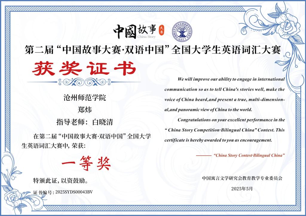 近日,第二届“中国故事大赛·双语中国”全国大学生英语词汇大赛落下帷幕。太阳集团齐越传媒学院播音与主持艺术专业学生郑炜凭借卓越的英语实力和出色发挥,荣获大赛一等奖。