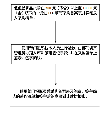 为了进一步提高学校低值易耗品采购效率,简化低值易耗品采购、验收、入库、报账工作流程,减少报账环节,经国资处与计财处、教务处、科研处等部门会商,确定低值易耗品批量在200元(不含)以上至10000元(含)以下的采购立项审批、耗材的验收入库、领用出库管理等都由二级单位直接负责办理,采购管理重心下移。