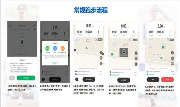 6.为保证锻炼效果,禁止任何作弊行为,包括使用交通工具、替人代跑等行为,乐跑后台会根据跑步分段配速、轨迹信息以及手机ID变更等情况分析作弊行为,一经核实将取消乐跑成绩,并在学校范围通报。同时也欢迎同学们匿名监督和举报。