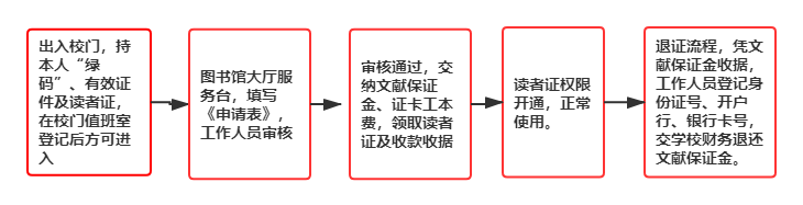 (2)服务台工作人员审核、登记相关信息,退回有效证件;读者缴纳文献保证金和读者证工本费,并领取收据。