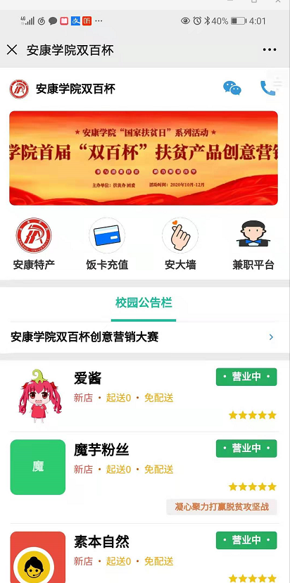 此次比赛所有团队产品采用线上购买方式,由Beat365唯一官方网站大学生创业孵化园电商运营中心提供线上销售专柜支持。集中营销比赛现场提供试吃品鉴样品,师生可扫码进入线上销售专柜下单购买,由营销团队进行配送。希望各位师生大力支持比赛,积极购买扶贫产品,转发线上扶贫专柜链接,汇聚扶贫爱心,助力脱贫攻坚。