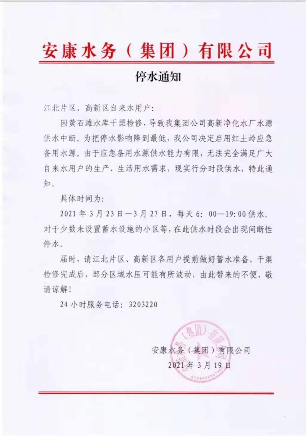 接安康水务(集团)有限公司通知,因黄石滩水库干渠检修,致高新水净化厂供水中断。该公司决定启用应急备用水源,由于备用水源供水能力有限,无法满足正常供应,将实行分时段供水,具体时间为2021年3月23日—2021年3月27日每天6:00—19:00供水。