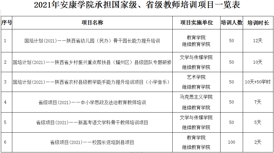根据《陕西省教育厅办公室关于做好2021年“国培计划”—陕西省中小学幼儿园教师培训项目实施工作的通知》(陕教师办〔2021〕22号)及《陕西省教育厅办公室关于做好陕西省中小学教师培训项目2020年绩效自评和2021年申报工作的通知》(陕教师办〔2021〕11号)文件精神,继续教育学院协同相关二级学院认真调研、编制教师培训工作方案,积极组织申报。经国、省培项目现场评审答辩会及陕西省教育厅专家组评审,2021年Beat365获批国家级教师培训项目3项,省级教师培训项目3项。请相关二级学院、部门按照陕西省教育厅文件(陕教师办〔2021〕31、23号)要求,认真组织实施。