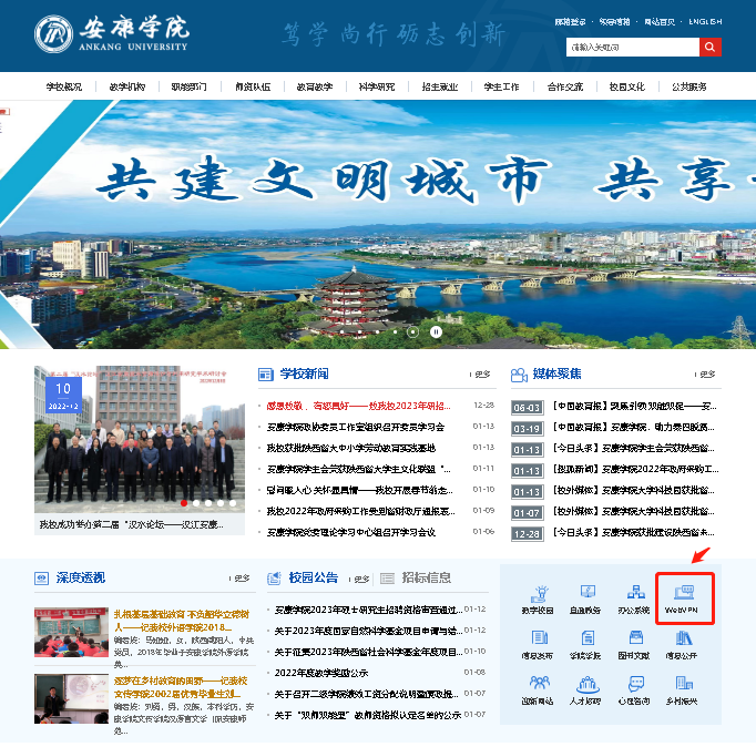 1.用浏览器打开学校官网,点击主页右下角校园直通板块WebVPN图标。