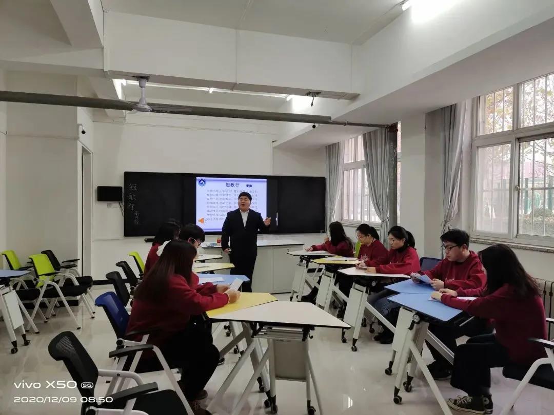 刘晓达同学在所做的《短歌行》教学设计里,为了突出新课改的核心素养,把15分钟的课分成三大板块,浑厚铿锵的朗诵为整堂课增色,课堂效果良好。