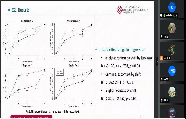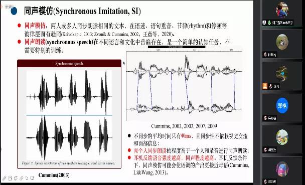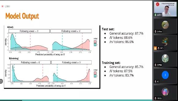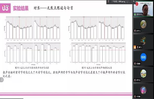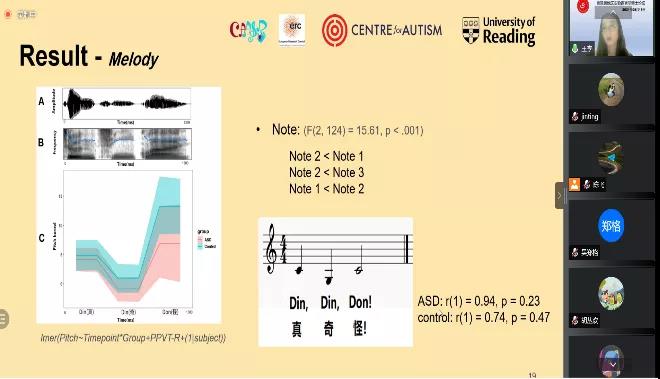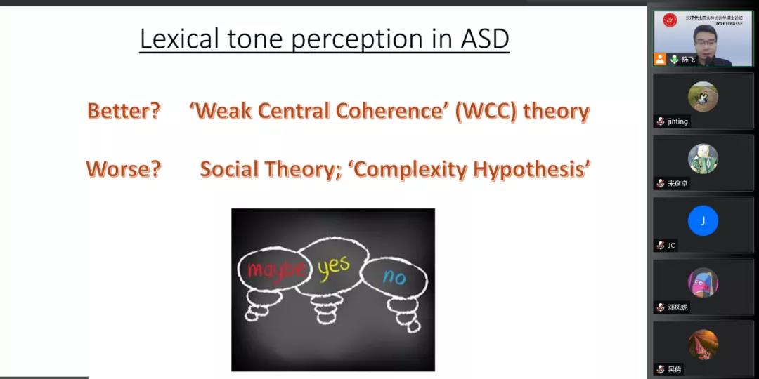 在特邀报告环节,湖南大学外国语学院陈飞教授作题为“汉语自闭症儿童语音范畴化感知研究”的报告,研究了普通话高功能的自闭症者对于声调和VOT的范畴化感知,结果表明同年龄的高功能的自闭症者对于声调的感知比VOT感知的范畴化感知程度要高,这可能与自闭症者在音高维度上的声学加工优势、时间维度上的声学加工缺陷有关。