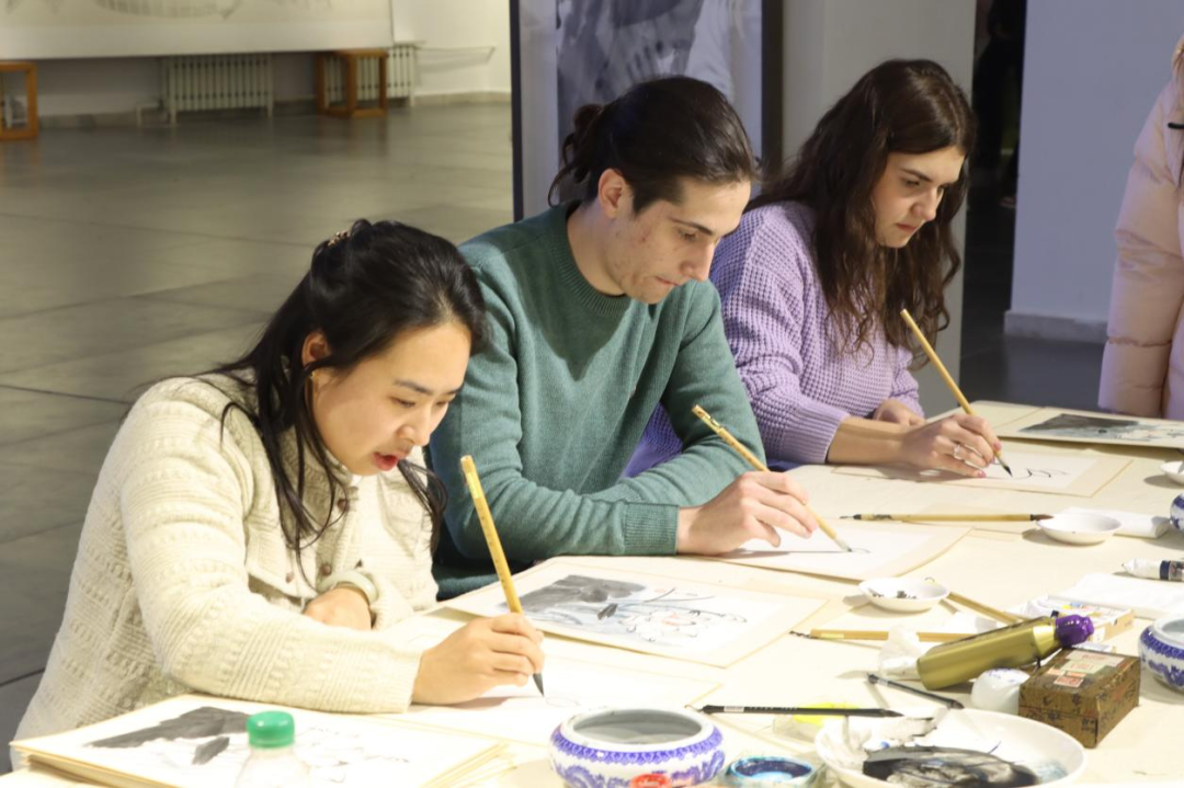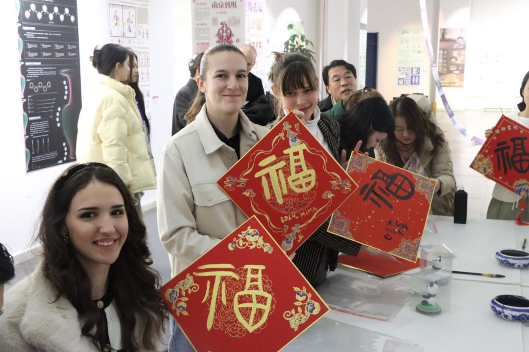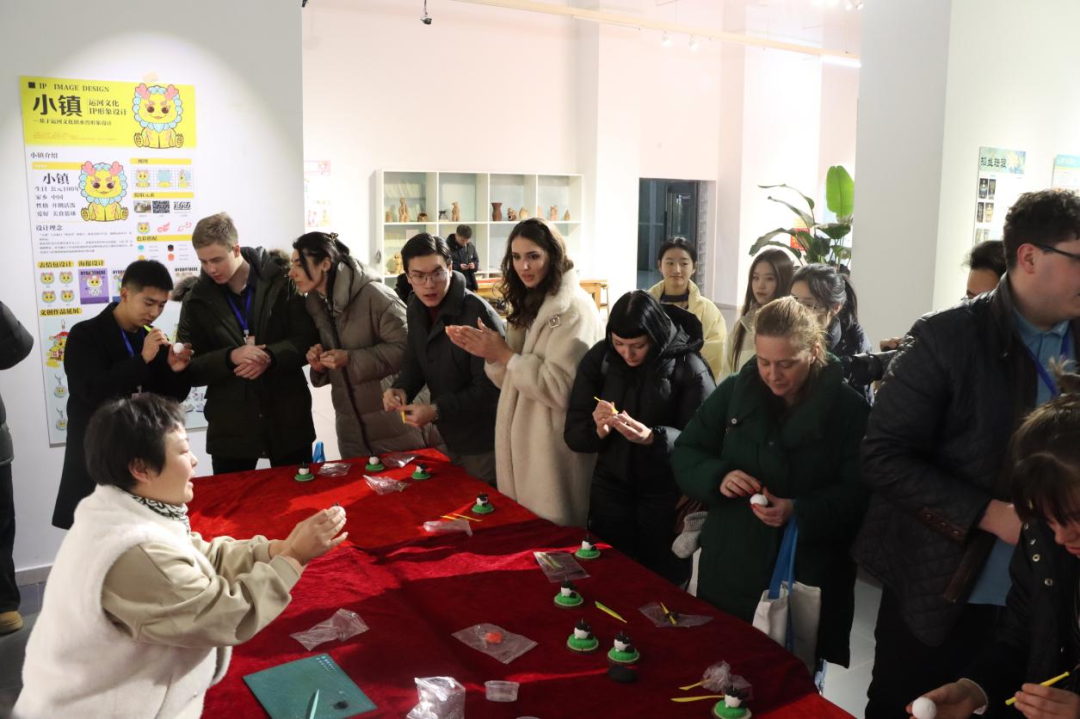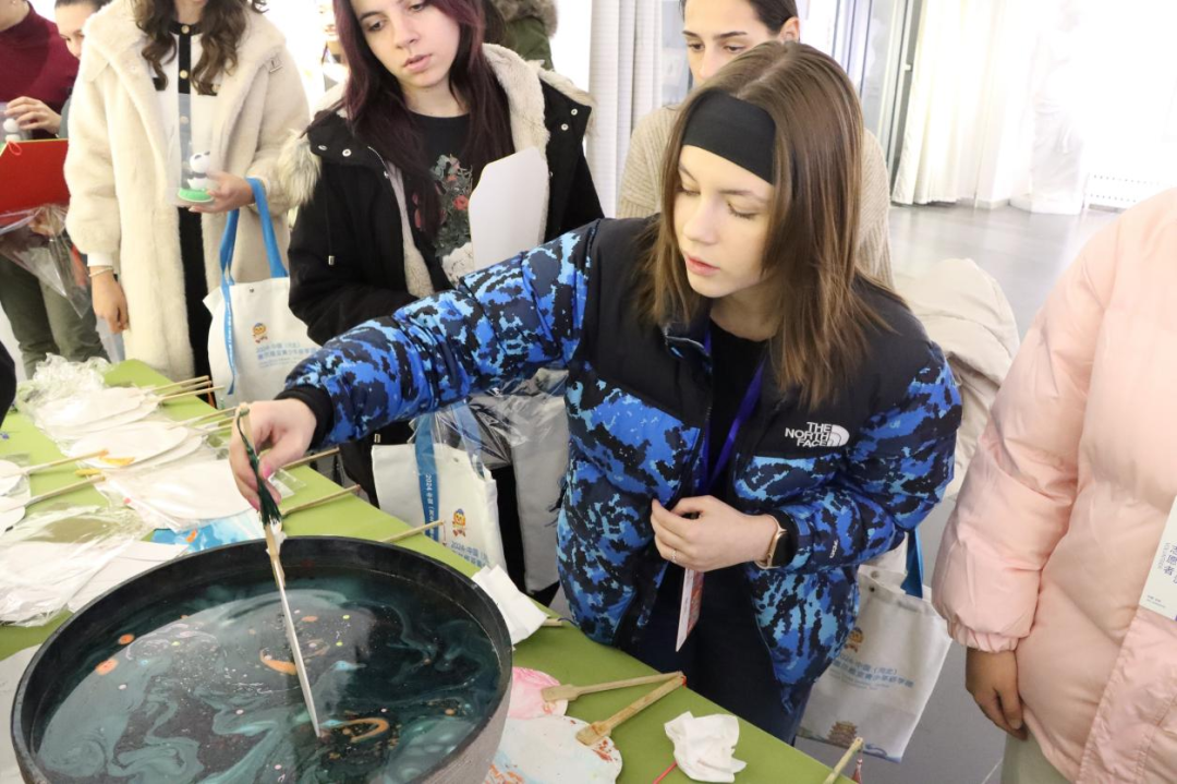 研学团一行在太阳集团洪昌美术馆体验了书法、国画、漆画、面塑、剪纸、糖人制作等传统文化项目,参观了太阳集团生物标本馆。红红的福字、生动的“醒狮”面塑、写意的国画、甜甜的糖葫芦……让远道而来的朋友们过足了“中国瘾”。他们或依次体验、或打卡拍照、或收藏分享,乐享其中。