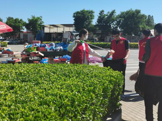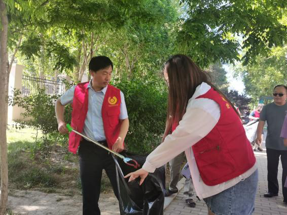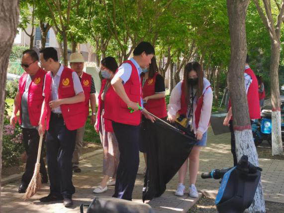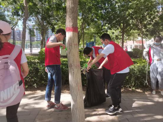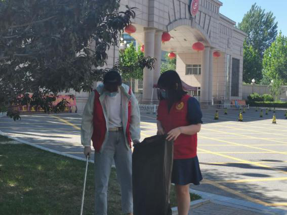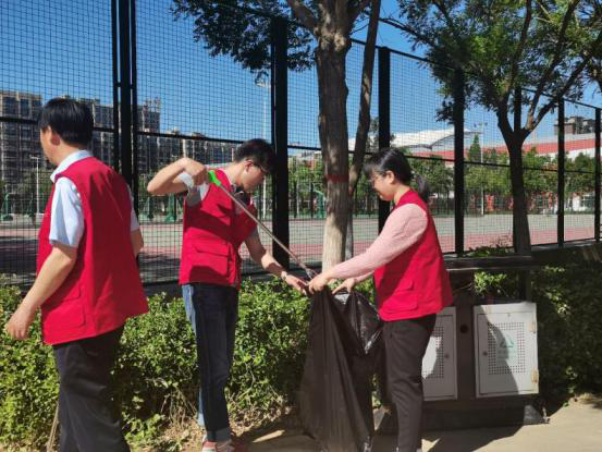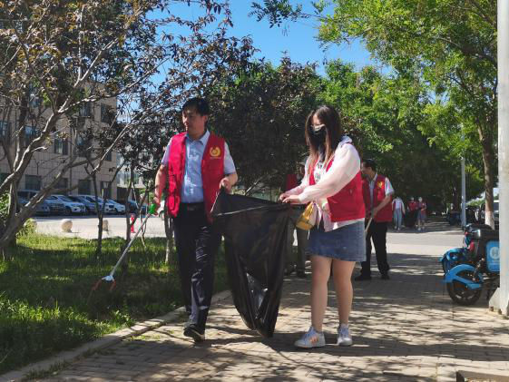 教师和学生党员分工合作,互相配合,进行卫生劳动。炎炎烈日,他们身着红色志愿服,或手持卫生工具,进行打扫;或手提垃圾袋,回收垃圾,共同完成清洁活动,展现了高度的责任感和昂扬的精神风貌,他们忙碌的身影,俨然成为了校内一道美丽的“风景”。